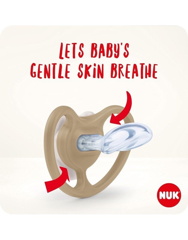 Oras ir meilė odai! Jūsų kūdikio oda yra švelni ir jautri. Nors kūdikiai mėgsta savo čiulptukus, čiulpimo seilės gali sudirginti odelę. Štai kodėl NUK sukūrė NUK Space čiulptukus, kad odai būtų oro ir erdvės kvėpuoti. Poveikis patvirtintas 99% mamų.*