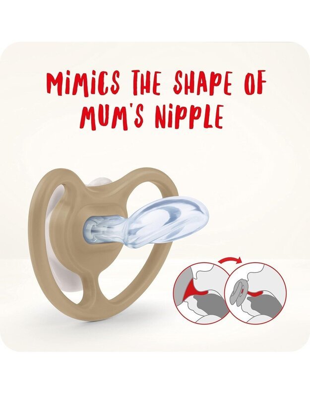 Žinoma, NUK Space čiulptuko žindukas turi originalią NUK formą, kuri sukurta pagal žindančios motinos spenelį. Tai reiškia, kad NUK čiulptukai padeda sveikai vystytis burnai, juos priima 95% kūdikių** ir jie nesukelia spenelių painiavos.**