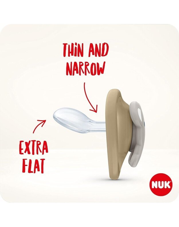 Žindukas toks plokščias, plonas ir siauras, kad puikiai telpa mažoje burnytėje ir palieka liežuviui bei žandikauliui pakankamai vietos natūraliems čiulpimo judesiams. Būtent taip, kaip patvirtina akušerės, pediatrai ir ortodontai**, kaip ir mamos***. Anatomiškai teisinga NUK forma yra ideali, nes natūralus čiulpimas ne tik užtikrina maisto pasisavinimą, bet ir įrodyta, kad padeda lavinti svarbius gebėjimus, tokius kaip taisyklingas būdas nuryti, kramtyti ir galiausiai kalbėti.