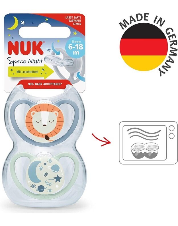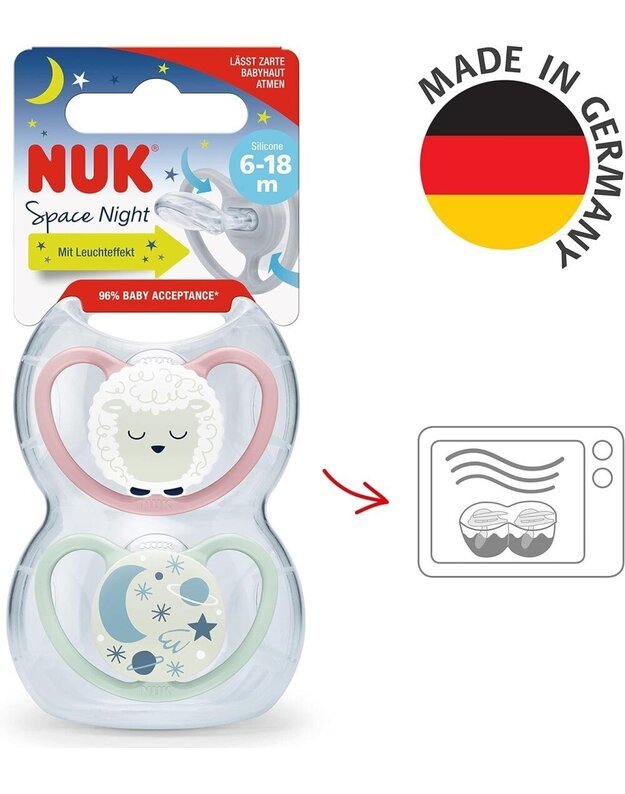 NUK Space Night čiulptukai padeda kūdikiui lengviau rasti kelią į sapnų pasaulį. Dėl kūdikiams saugios šviečiančios medžiagos čiulptukai skleidžia švelnų švytėjimą tamsoje, todėl greitai ir lengvai jį rasite net tamsiausią naktį.